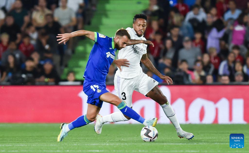 Eder Militao (R) of Real Madrid vies with Borja Mayoral of Getafe during their La Liga football football match in Getafe, Spain, Oct. 8, 2022. (Photo by Gustavo Valiente/Xinhua)