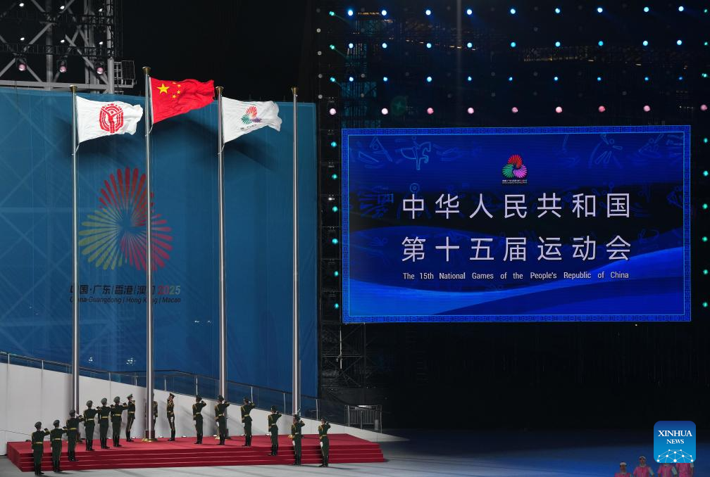 Flags are raised during the closing ceremony of China's 15th National Games in Shenzhen, south China's Guangdong Province, Nov. 21, 2025. [Photo/Xinhua]