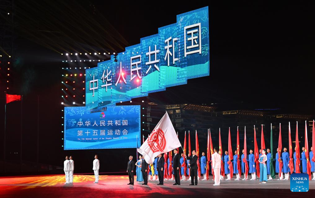 The National Games Flag handover ceremony is seen during the closing ceremony of China's 15th National Games in Shenzhen, south China's Guangdong Province, Nov. 21, 2025. [Photo/Xinhua]