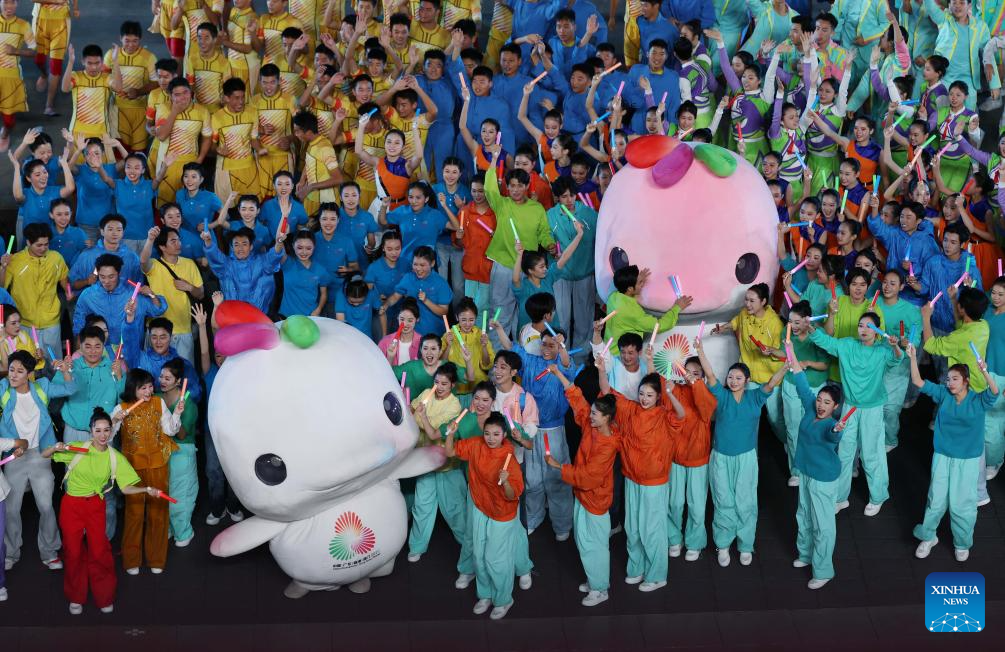 Mascots interact with members of delegations during the closing ceremony of China's 15th National Games in Shenzhen, south China's Guangdong Province, Nov. 21, 2025. [Photo/Xinhua]
