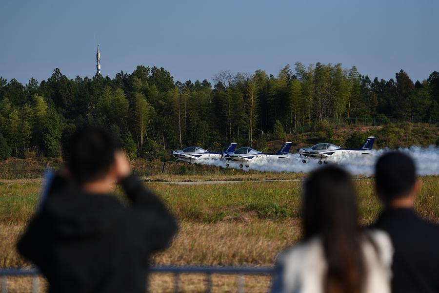 Visitors watch an air show during the 2025 Hunan International General Aviation and Low Altitude Economy Industry Expo at the Lusong Airport of Zhuzhou city, central China's Hunan province, Nov. 21, 2025. [Photo/Xinhua]