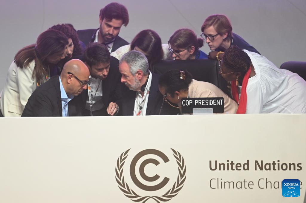 President of the 30th United Nations Climate Change Conference (COP30) Andre Correa do Lago (2nd L, front) discusses with UN Climate Change Executive Secretary Simon Stiell (1st L, front) and other staff members during a plenary session of the COP30 in Belem, Brazil, on Nov. 22, 2025. The COP30 on Saturday approved a document titled "Global Mutirao: Uniting humanity in a global mobilization against climate change" during its closing session. (Photo by Lucio Tavora/Xinhua)