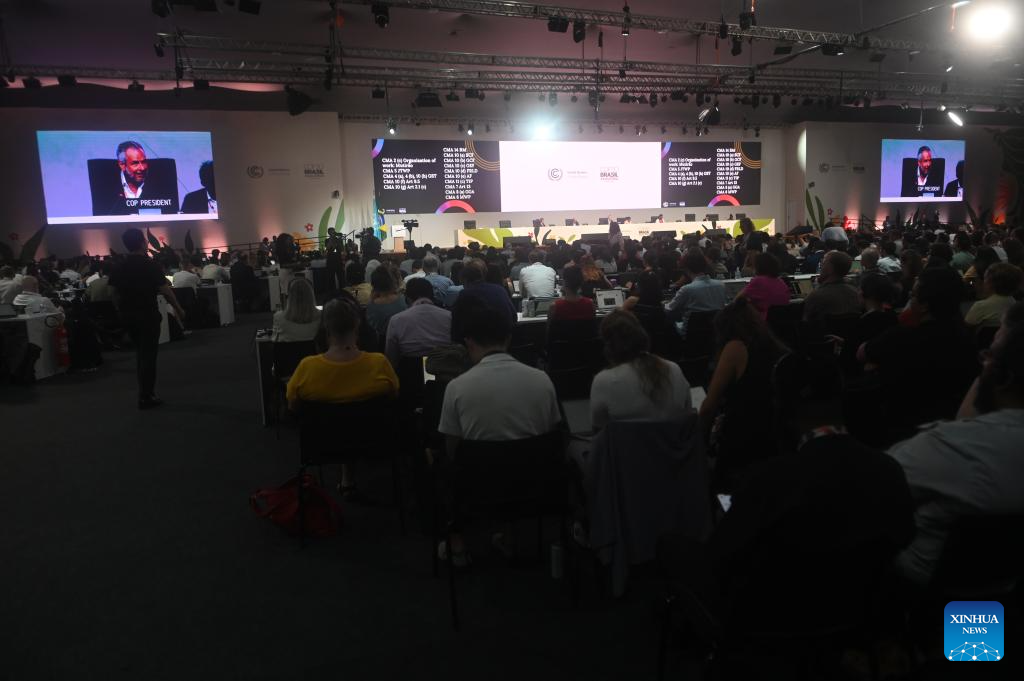 Delegates attend a plenary session of the 30th United Nations Climate Change Conference (COP30) in Belem, Brazil, Nov. 22, 2025. The COP30 on Saturday approved a document titled "Global Mutirao: Uniting humanity in a global mobilization against climate change" during its closing session. (Photo by Lucio Tavora/Xinhua)