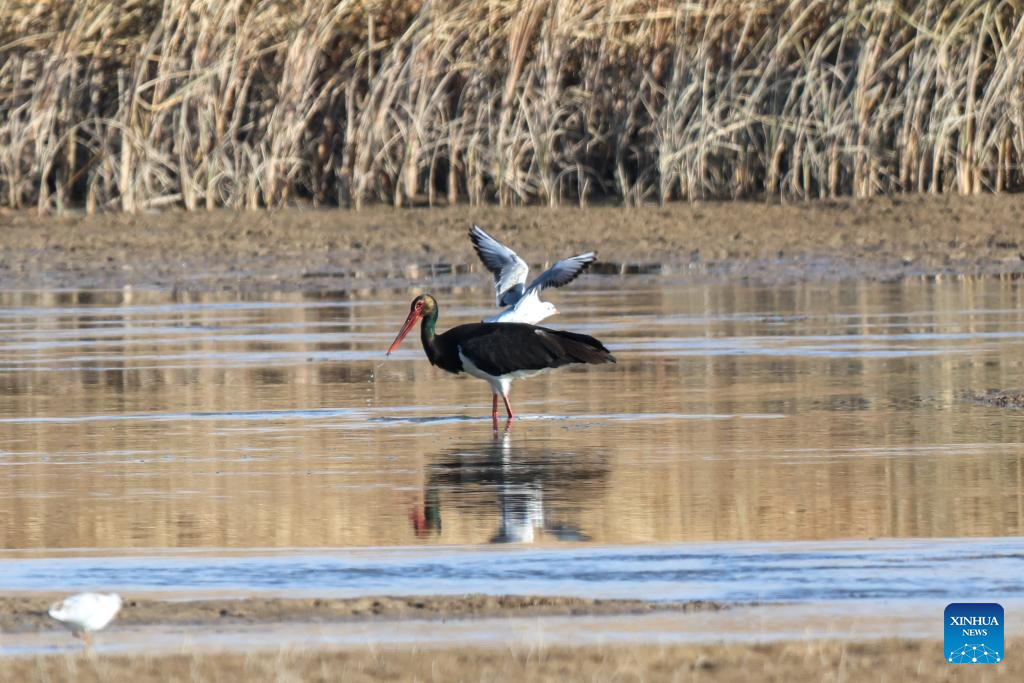 This photo taken on Nov. 12, 2025 shows black storks foraging at a wetland in Heihe Wetland National Nature Reserve in the city of Zhangye, northwest China's Gansu Province. (Xinhua/Lang Bingbing)