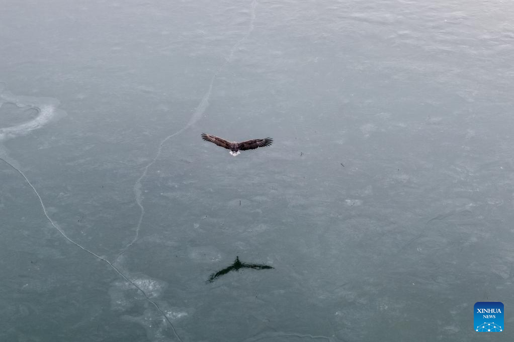 An aerial drone photo taken on Nov. 22, 2025 shows a white-tailed sea eagle at a reservoir in Shiyanghe River National Wetland Park in Minqin County of Wuwei City, northwest China's Gansu Province. (Xinhua/Lang Bingbing)
