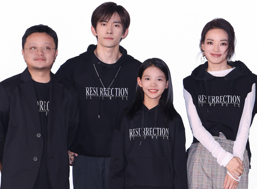 Director Bi Gan, actors Jackson Yee, Guo Mucheng and Shu Qi pose for a photo at the premiere of "Resurrection" in Beijing, Nov. 21, 2025. [Photo courtesy of Lima Media]
