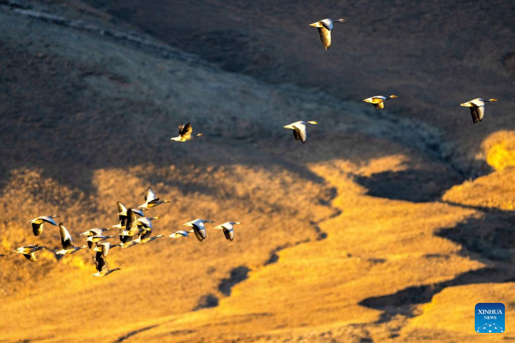 This photo taken on Nov. 23, 2025 shows migratory birds in Lhunzhub County of Lhasa, southwest China's Xizang Autonomous Region. (Xinhua/Li Jian)