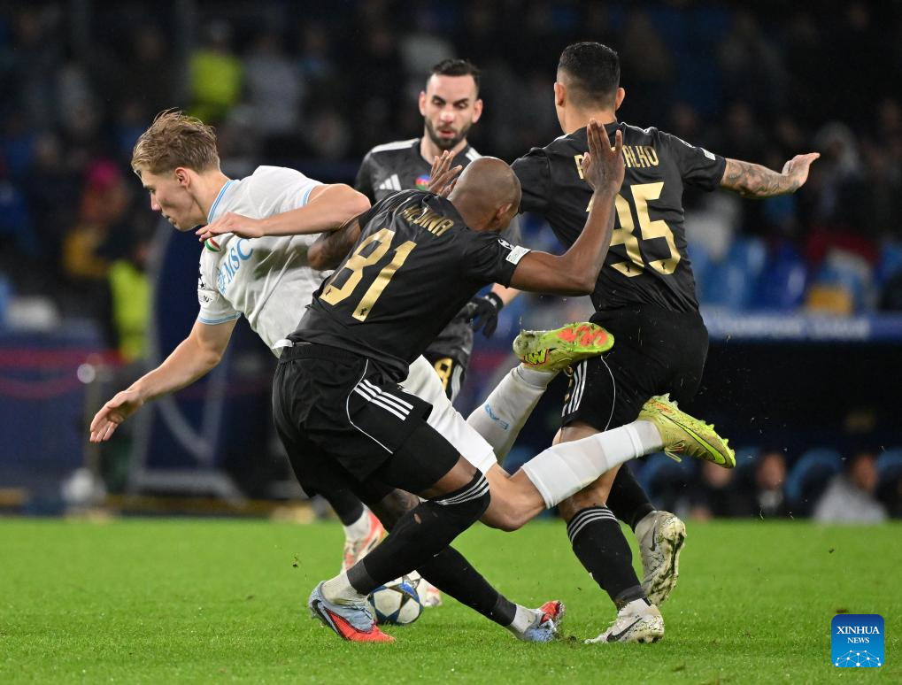 Napoli's Rasmus Hojlund (L) vies with Qarabag's Kevin Medina (C) and Pedro Bicalho during the UEFA Champions League match between Napoli and Qarabag in Naples, Italy, Nov. 25, 2025. (Photo by Alberto Lingria/Xinhua)