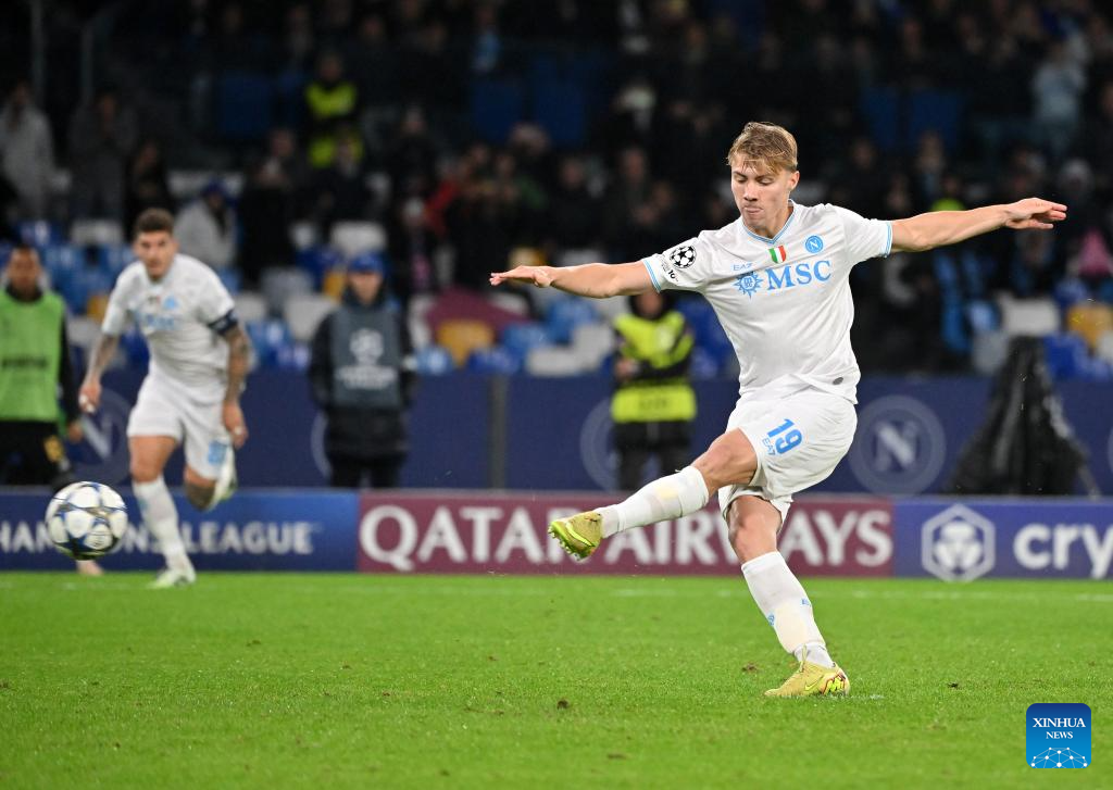 Napoli's Rasmus Hojlund takes and misses a penalty kick during the UEFA Champions League match between Napoli and Qarabag in Naples, Italy, Nov. 25, 2025. (Photo by Alberto Lingria/Xinhua)