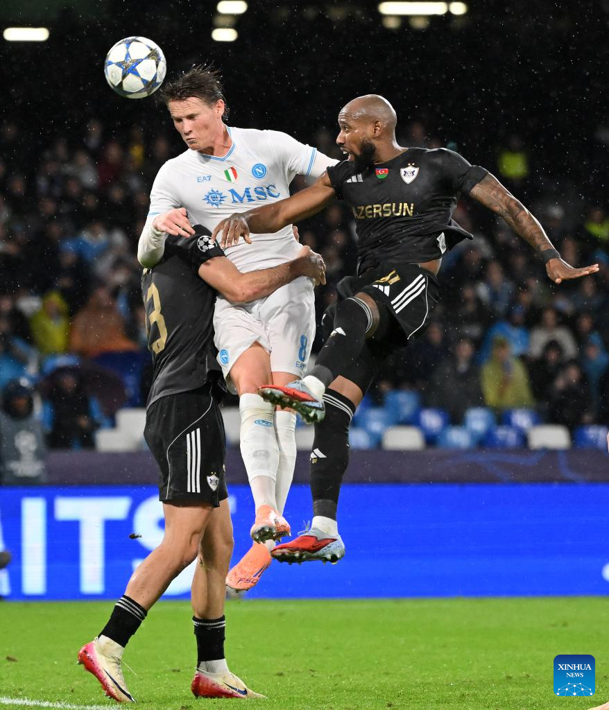 Napoli's Scott McTominay (front R) shoots and scores during the UEFA Champions League match between Napoli and Qarabag in Naples, Italy, Nov. 25, 2025. (Photo by Alberto Lingria/Xinhua)