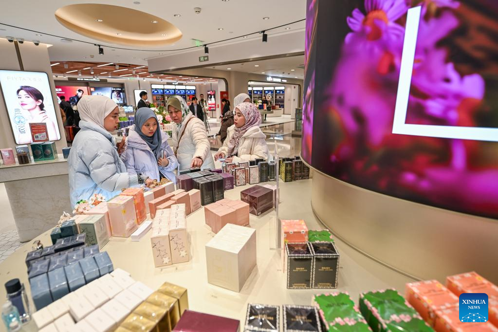 Customers from Malaysia select products at Xi'an Downtown Duty Free Shop in Xi'an, northwest China's Shaanxi Province, Nov. 26, 2025. (Xinhua/Zou Jingyi)