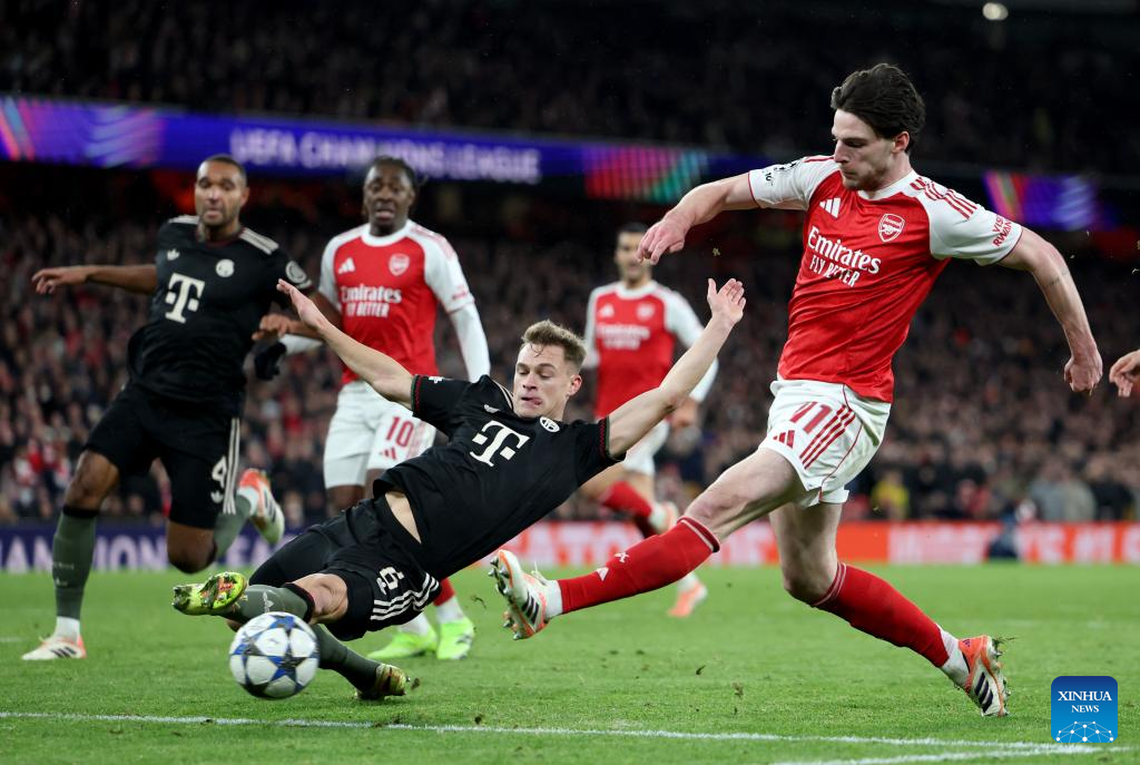 Arsenal's Declan Rice (1st R) shoots during the UEFA Champions League football match between Arsenal and Bayern Munich in London, Britain, Nov. 26, 2025. (Xinhua/Li Ying)