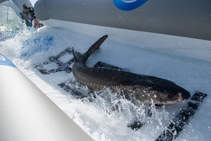 A Chinese sturgeon is released to the Yangtze River in Yichang, central China's Hubei province, March 28, 2024. [Photo/Xinhua]