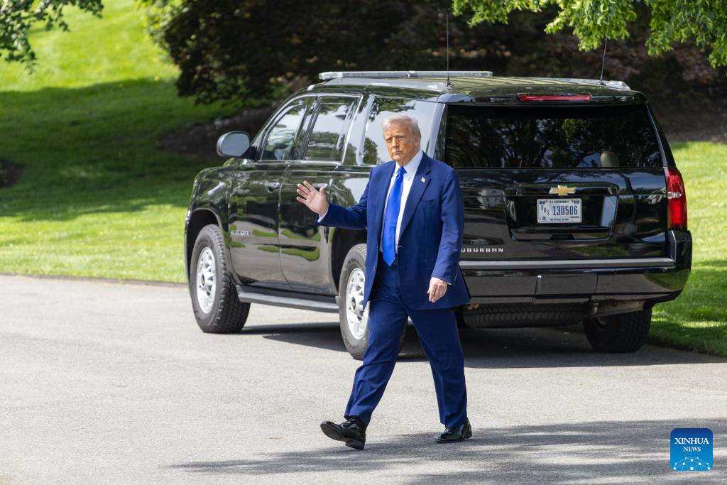 U.S. President Donald Trump waves to the press as he walks to board Marine One at the White House in Washington, D.C., the United States, on May 12, 2025. [Photo/Xinhua]