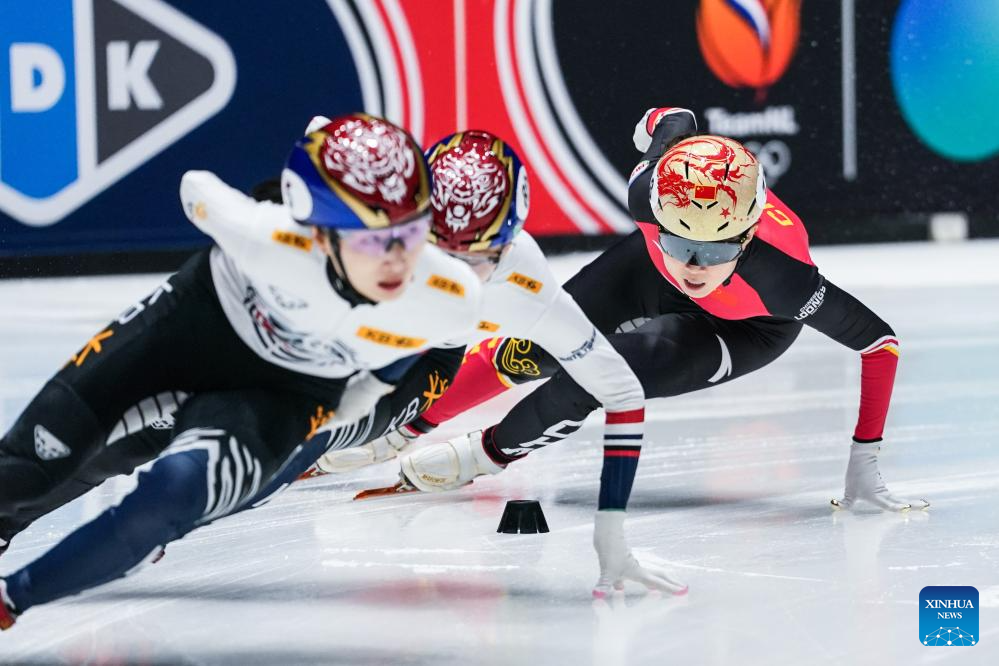 Gong Li (R) of China competes during the women's 1500m quarterfinals at the ISU Short Track World Tour #4 speed skating event in Dordrecht, the Netherlands, Nov. 28, 2025. (Xinhua/Peng Ziyang)