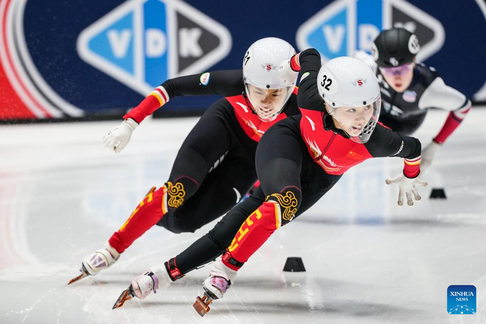 Yang Jingru (front) of China competes during the women's 1500m quarterfinals at the ISU Short Track World Tour #4 speed skating event in Dordrecht, the Netherlands, Nov. 28, 2025. (Xinhua/Peng Ziyang)