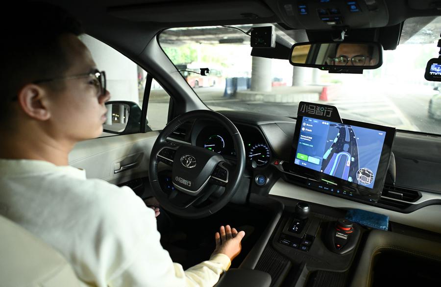 A safety staff member observes as a robotaxi of Pony.ai, a Chinese autonomous driving solution provider, steers automatically at the Canton Tower, a landmark in Guangzhou, south China's Guangdong Province, March 11, 2025. [Photo/Xinhua]