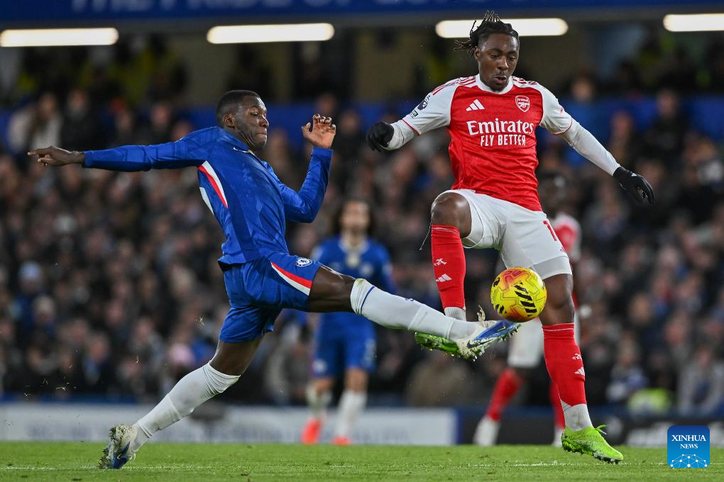 Eberechi Eze (R) of Arsenal vies with Moises Caicedo of Chelsea during the English Premier League match between Arsenal FC and Chelsea FC in London, Britain, on Nov. 30, 2025. (Xinhua)