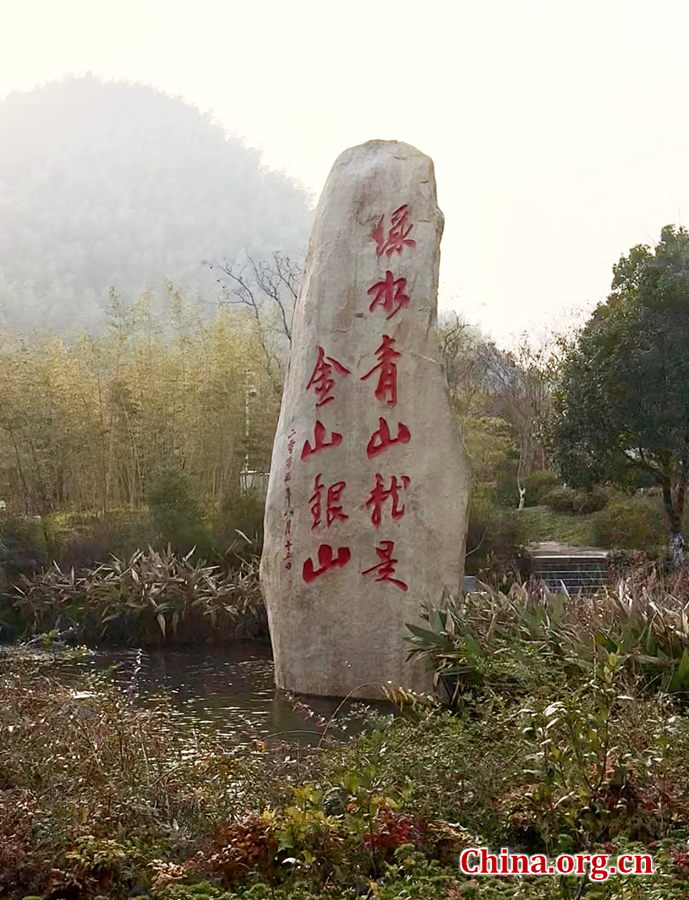 A stone engraved with the phrase "lucid waters and lush mountains are invaluable assets" at Yucun village in Anji county, Huzhou city, Zhejiang province, Dec. 1, 2025. [Photo by Chen Xinyan/China.org.cn]