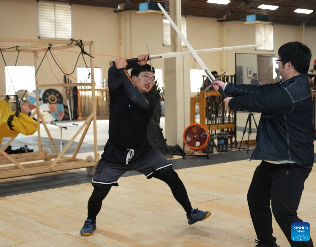 She Yuran (L) teaches a student at the Shanghai Historical Martial Arts (SHMA) club in Shanghai, east China, Nov. 22, 2025. [Photo/Xinhua]