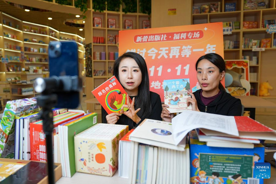 Women sell books via livestreaming at a reading space in north China's Tianjin, Nov. 11, 2024. (Xinhua/Sun Fanyue)