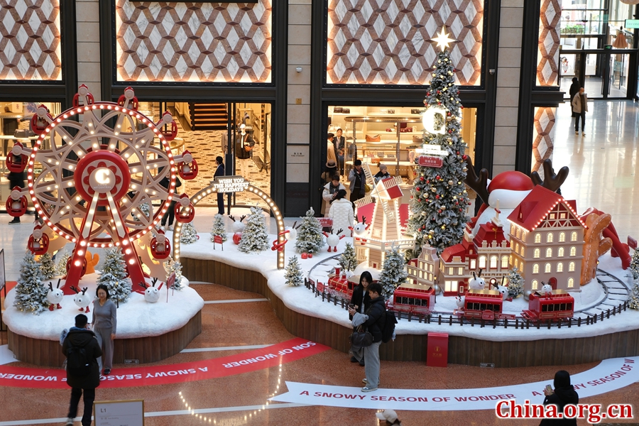 This holiday season-themed decorations can be found in the atrium of WF Central on Wangfujing Street, a time-honored commercial street in Beijing, Dec. 3, 2025. A luxury mall on Beijing's Wangfujing shopping street is welcoming winter with festive installations, including street-wide displays and an outdoor ice rink that has attracted visitors and skaters. [Photo by Liao Jiaxin/China.org.cn]