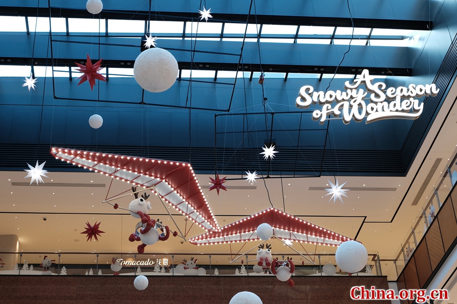 Delicate installations are hung inside WF Central on Wangfujing Street, Beijing, Dec. 3, 2025. A luxury mall on Beijing's Wangfujing shopping street is welcoming winter with festive installations, including street-wide displays and an outdoor ice rink that has attracted visitors and skaters. [Photo by Liao Jiaxin/China.org.cn]