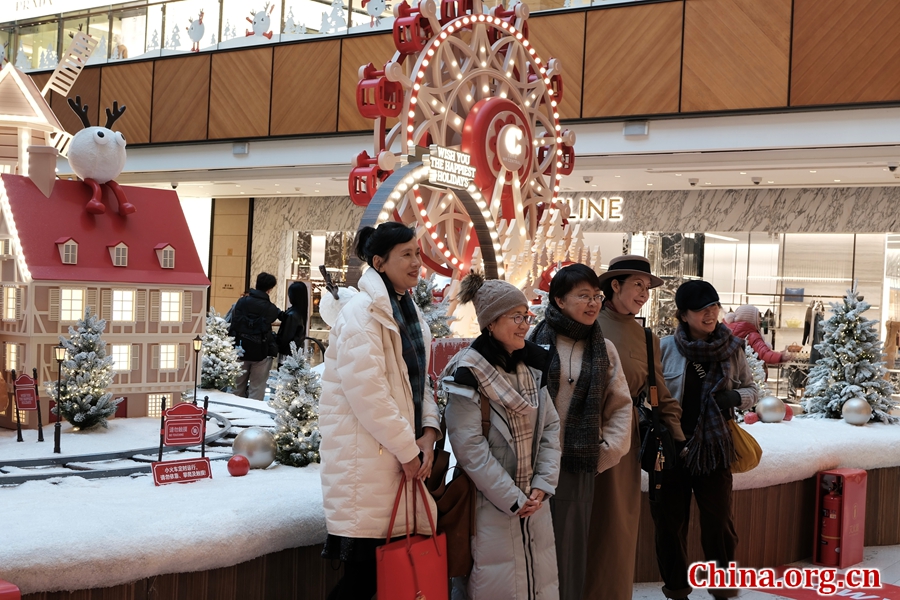 People pose for photos in front of an exquisite winter holiday themed installation at WF Central on Wangfujing Street, Beijing, Dec. 3, 2025. A luxury mall on Beijing's Wangfujing shopping street is welcoming winter with festive installations, including street-wide displays and an outdoor ice rink that has attracted visitors and skaters. [Photo by Liao Jiaxin/China.org.cn]