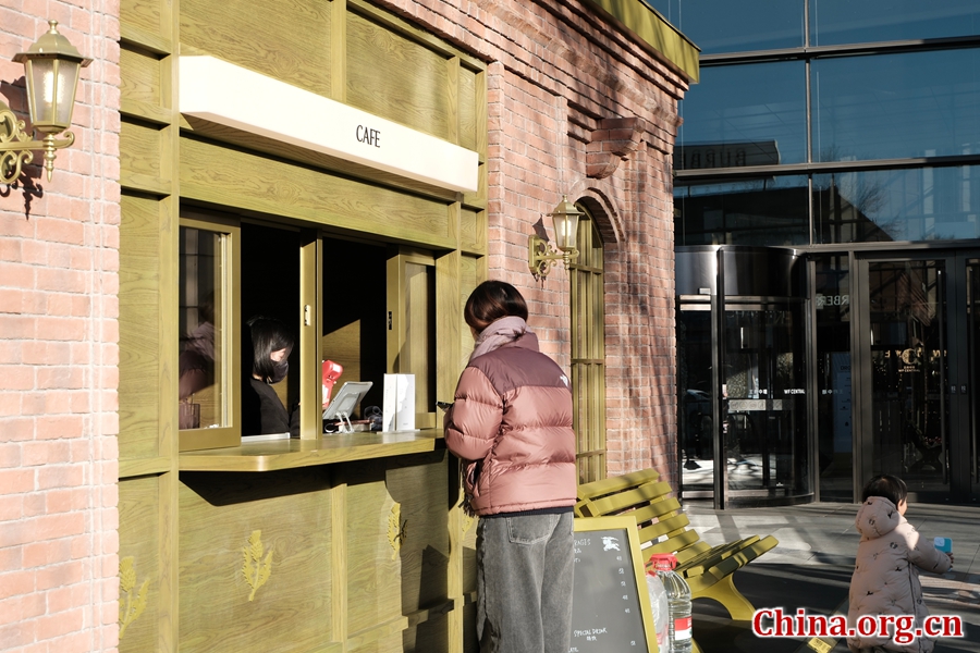 A woman buys coffee at a café next to the ice rink on Wangfujing Street, Beijing, Dec. 3, 2025. A luxury mall on Beijing's Wangfujing shopping street is welcoming winter with festive installations, including street-wide displays and an outdoor ice rink that has attracted visitors and skaters. [Photo by Liao Jiaxin/China.org.cn]