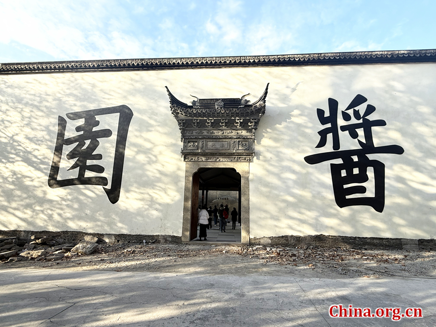 A wall with "Jiang Yuan" (meaning "sauce garden") written on it at Shendang Brewery, Shendang town, Haiyan county, Jiaxing, east China's Zhejiang province, Dec. 4, 2025. [Photo by Chen Xinyan/China.org.cn]