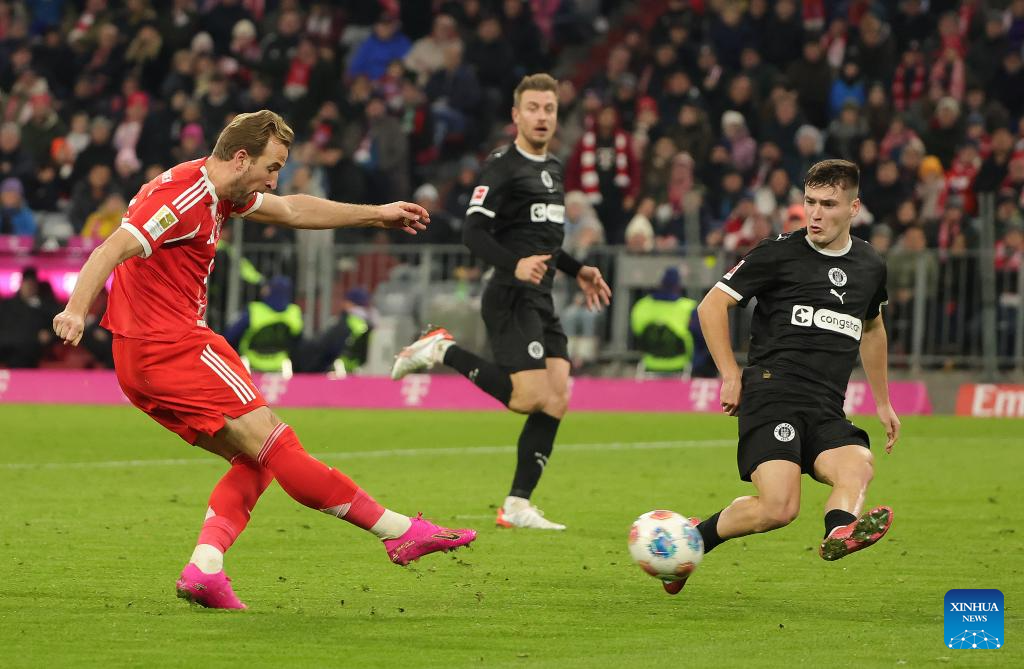 (Harry Kane (L) of FC Bayern Munich vies with Arkadiusz Pyrka (R) of FC St. Pauli during the German first division Bundesliga football match between FC Bayern Munich and FC St. Pauli in Munich, Germany, Nov. 29, 2025. (Photo by Philippe Ruiz/Xinhua)
