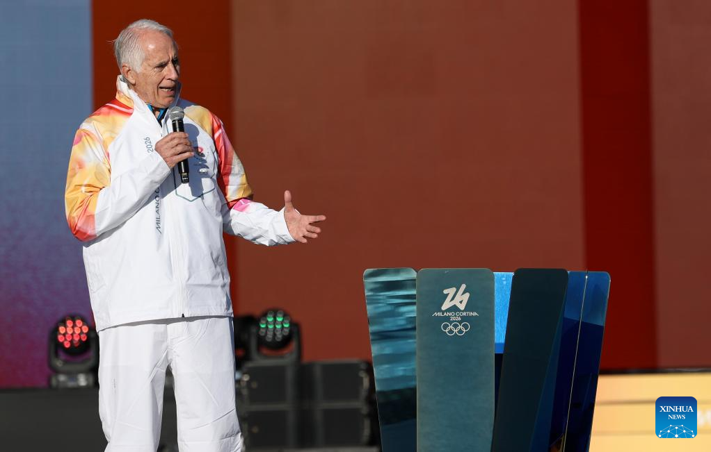 President of the organizing committee for the 2026 Winter Olympics Giovanni Malago speaks during the ceremony marking the official start of the torch relay for 2026 Milan-Cortina Winter Olympics in Rome, Italy, Dec. 6, 2025. (Xinhua/Li Jing)
