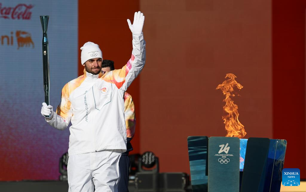 Italian swimmer Gregorio Paltrinieri holds the torch at the start of the torch relay for 2026 Milan-Cortina Winter Olympics in Rome, Italy, Dec. 6, 2025. (Xinhua/Li Jing)