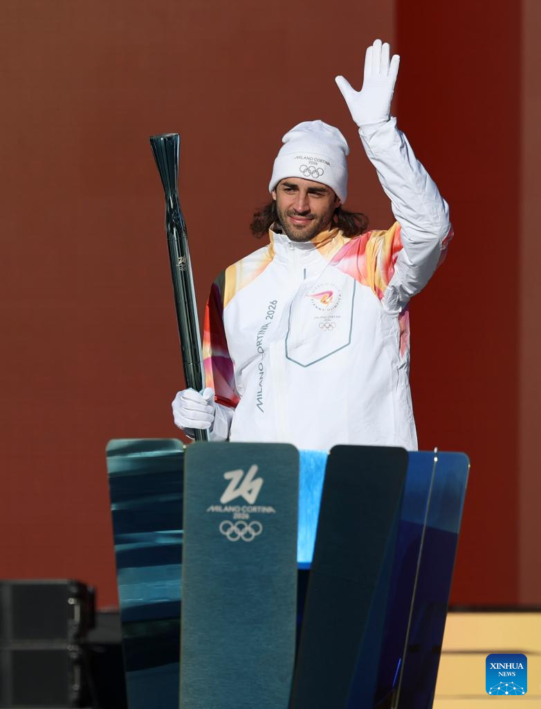 Torchbearer, Italian athlete Gianmarco Tamberi holds the torch during the torch relay for 2026 Milan-Cortina Winter Olympics in Rome, Italy, Dec. 6, 2025. (Xinhua/Li Jing)