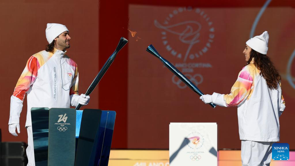 Italian athlete Gianmarco Tamberi (L) receives the flame from Italian former fencer Elisa Di Francisca during the torch relay for 2026 Milan-Cortina Winter Olympics in Rome, Italy, Dec. 6, 2025. (Xinhua/Li Jing)
